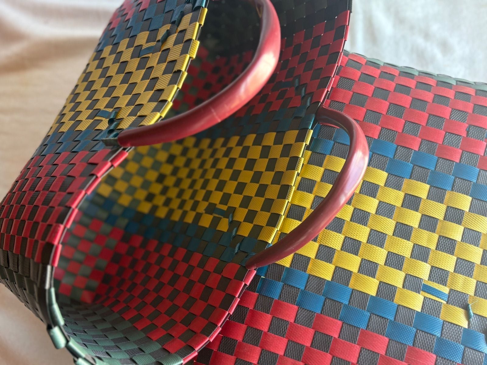 荷造り用プラスチックテープで編まれたベトナムのプラかごです。強度抜群!