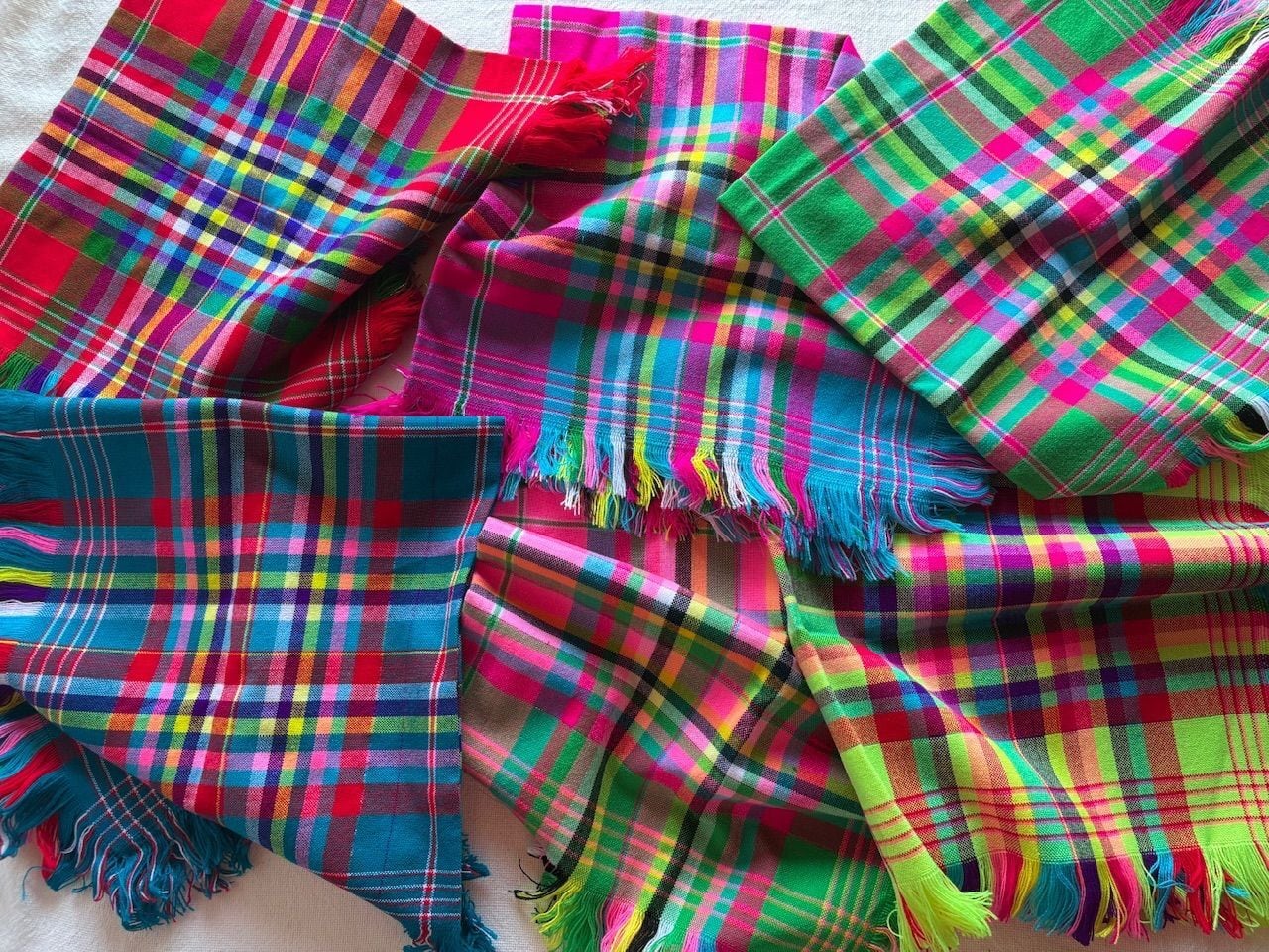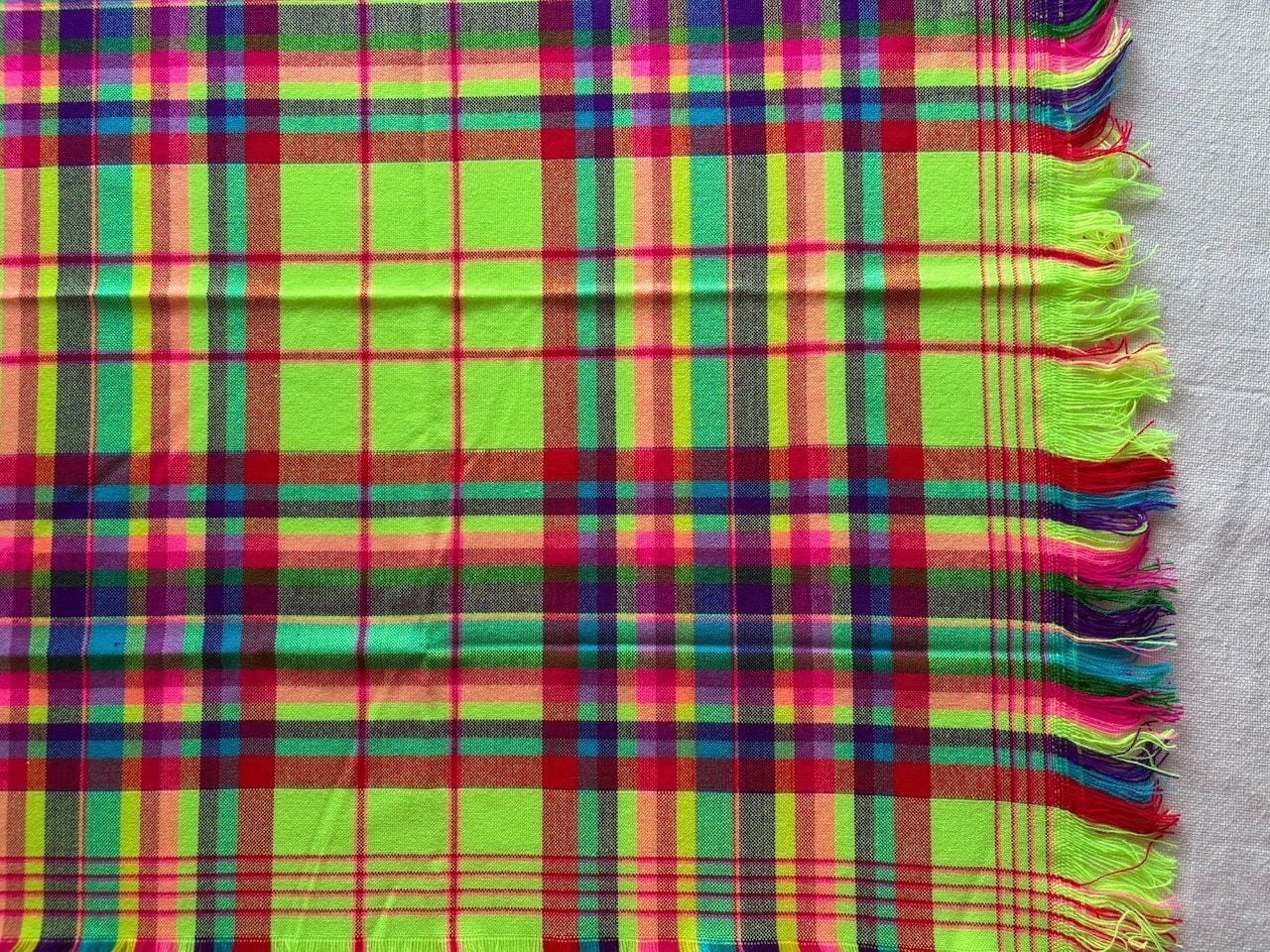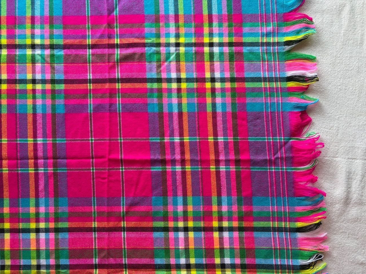 厚手のウールで編んだスカーフ。明るく鮮やかな色で、ほつれにくいです。