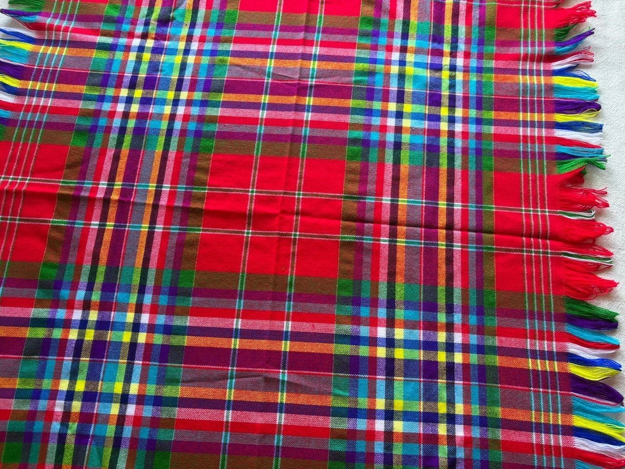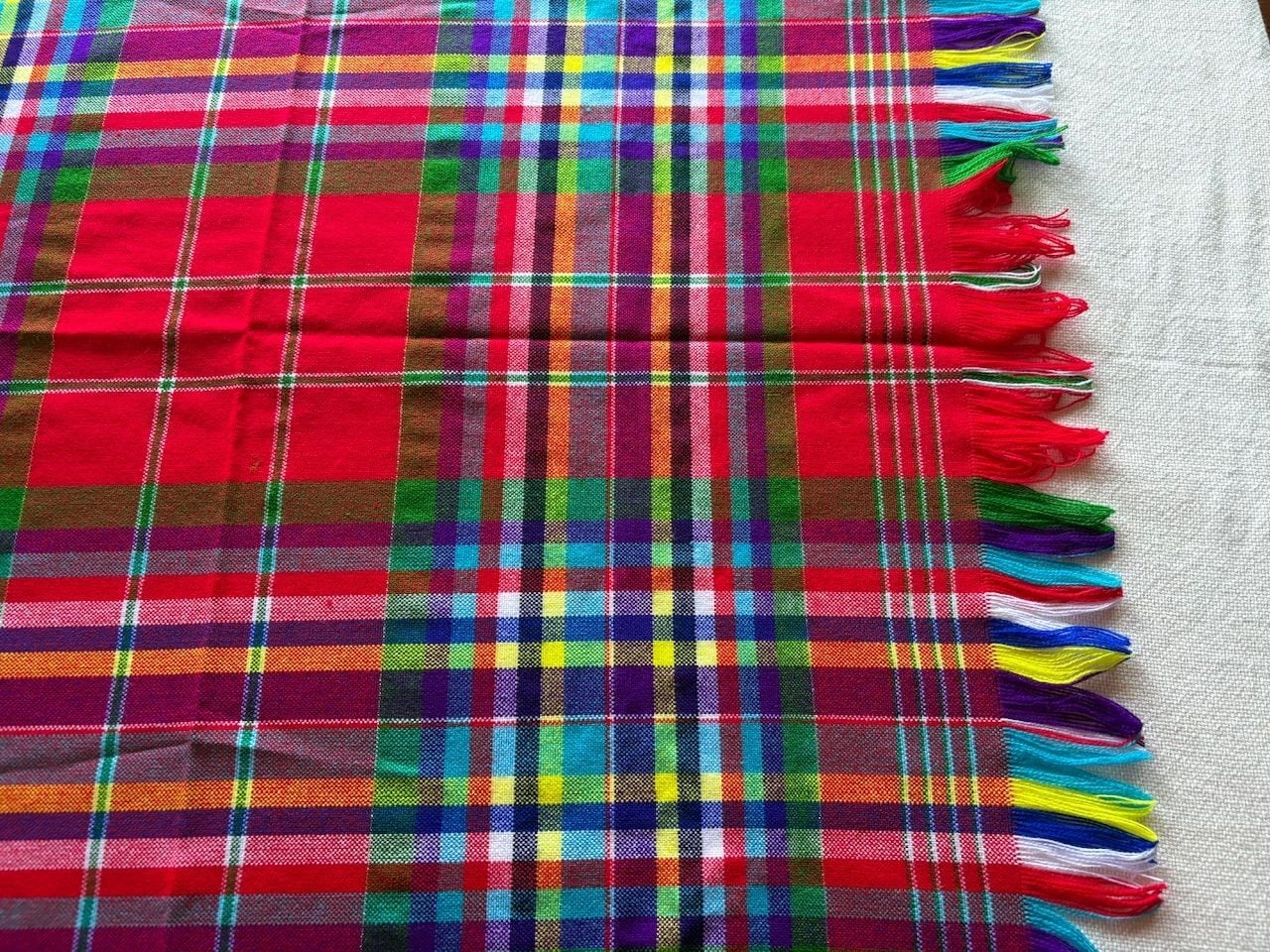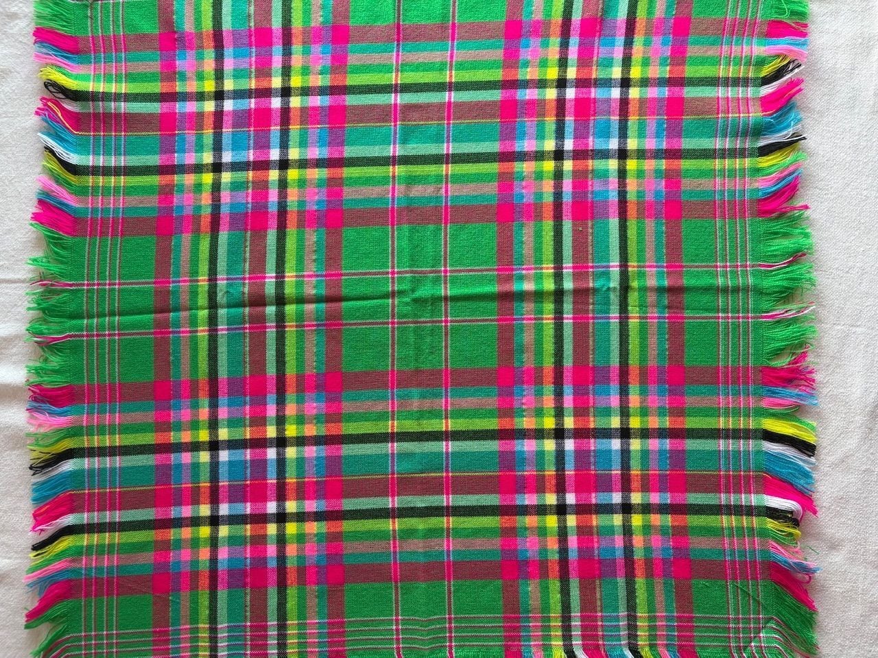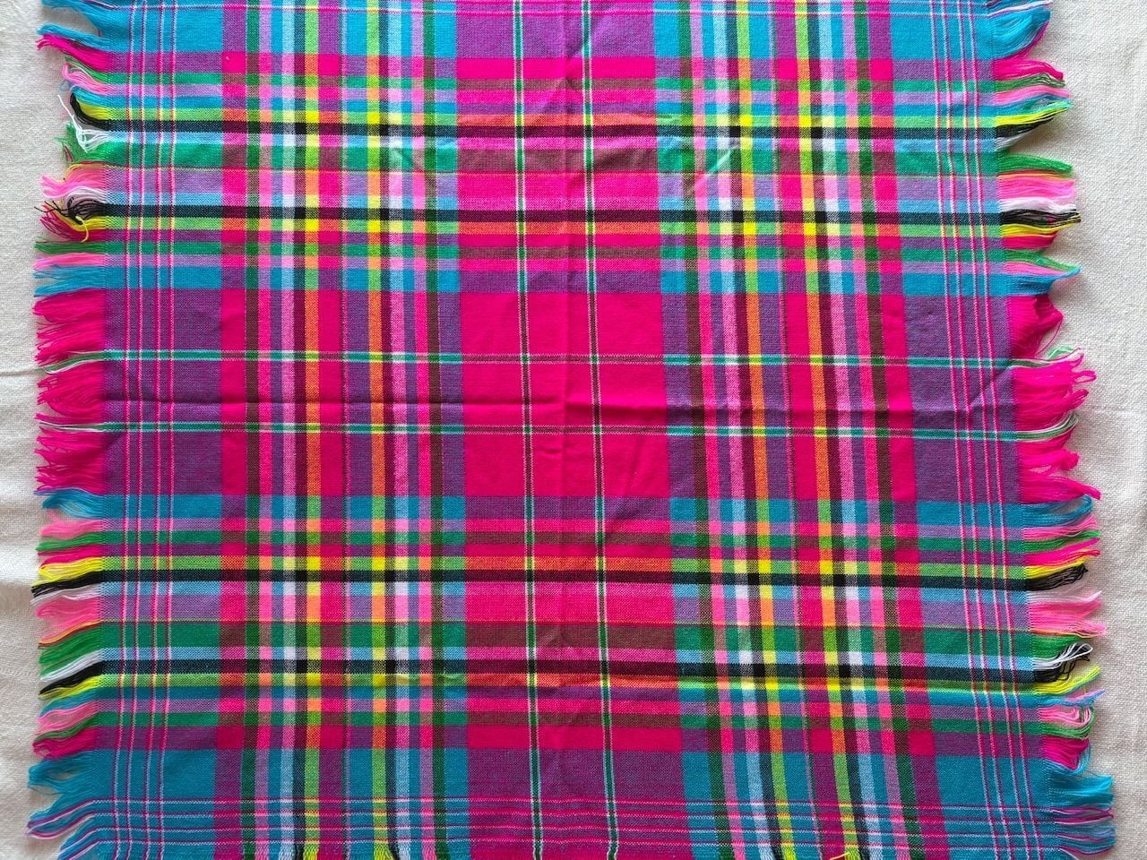 厚手のウールで編んだスカーフ。明るく鮮やかな色で、ほつれにくいです。