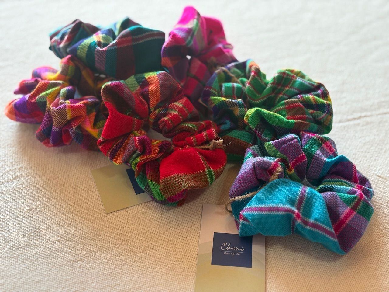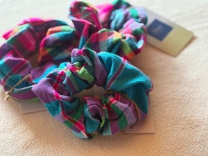 モン族の女性が頭に被っているチェック柄のスカーフを使用したシュシュ。