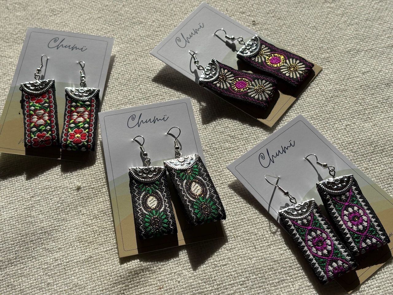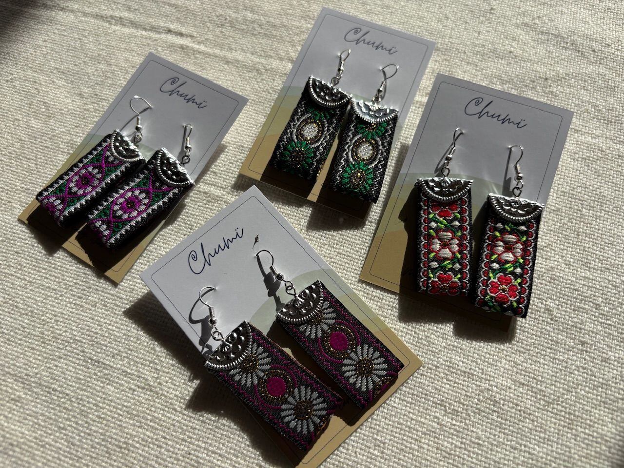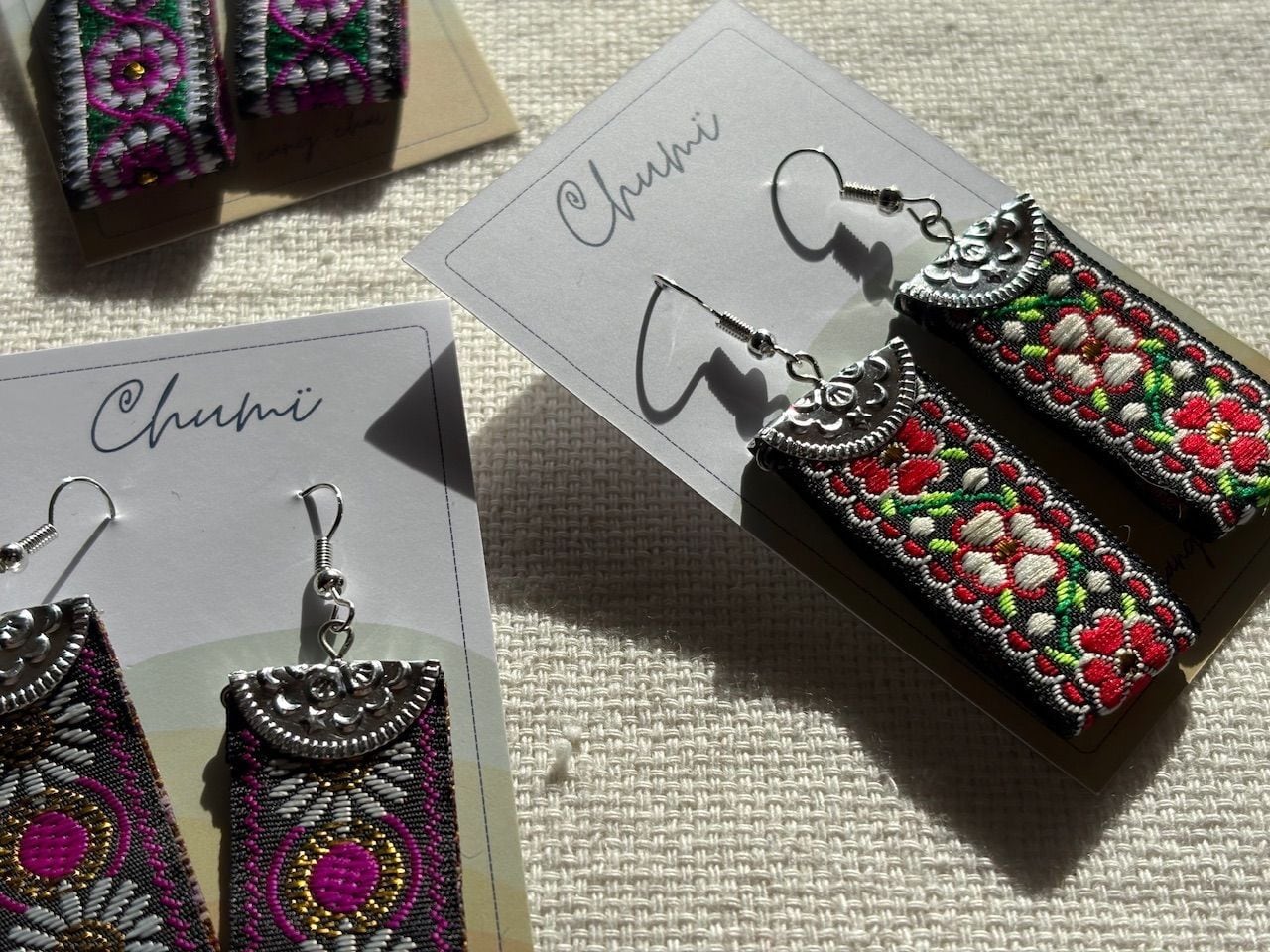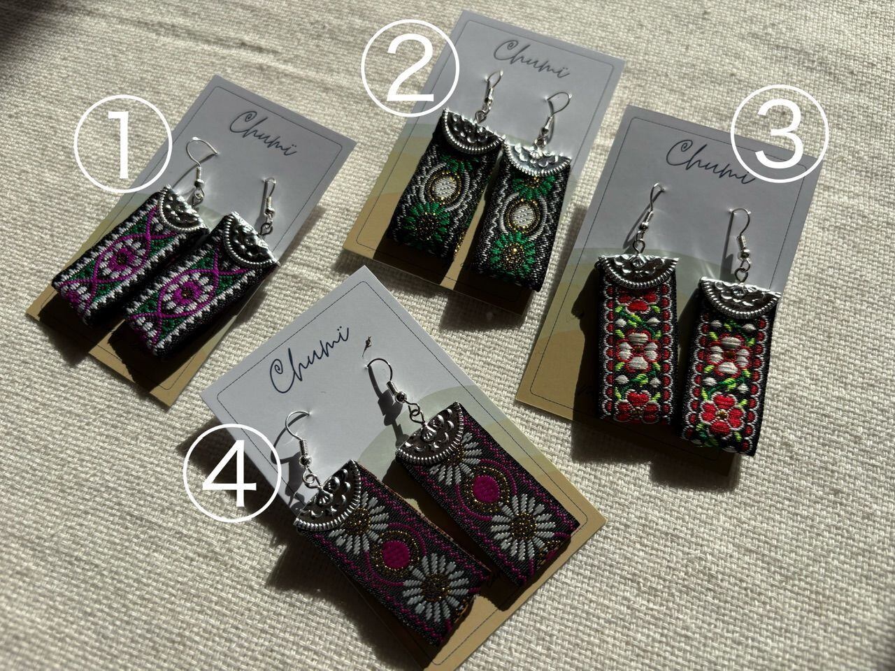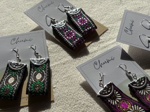 ベトナム北部ムーカンチャイの、少数民族モン族の女性による手仕事から生まれた特別なアクセサリーです。モン族の民族衣装に使われているリボン布と銀のコイン飾りが組み合わさったピアスです。