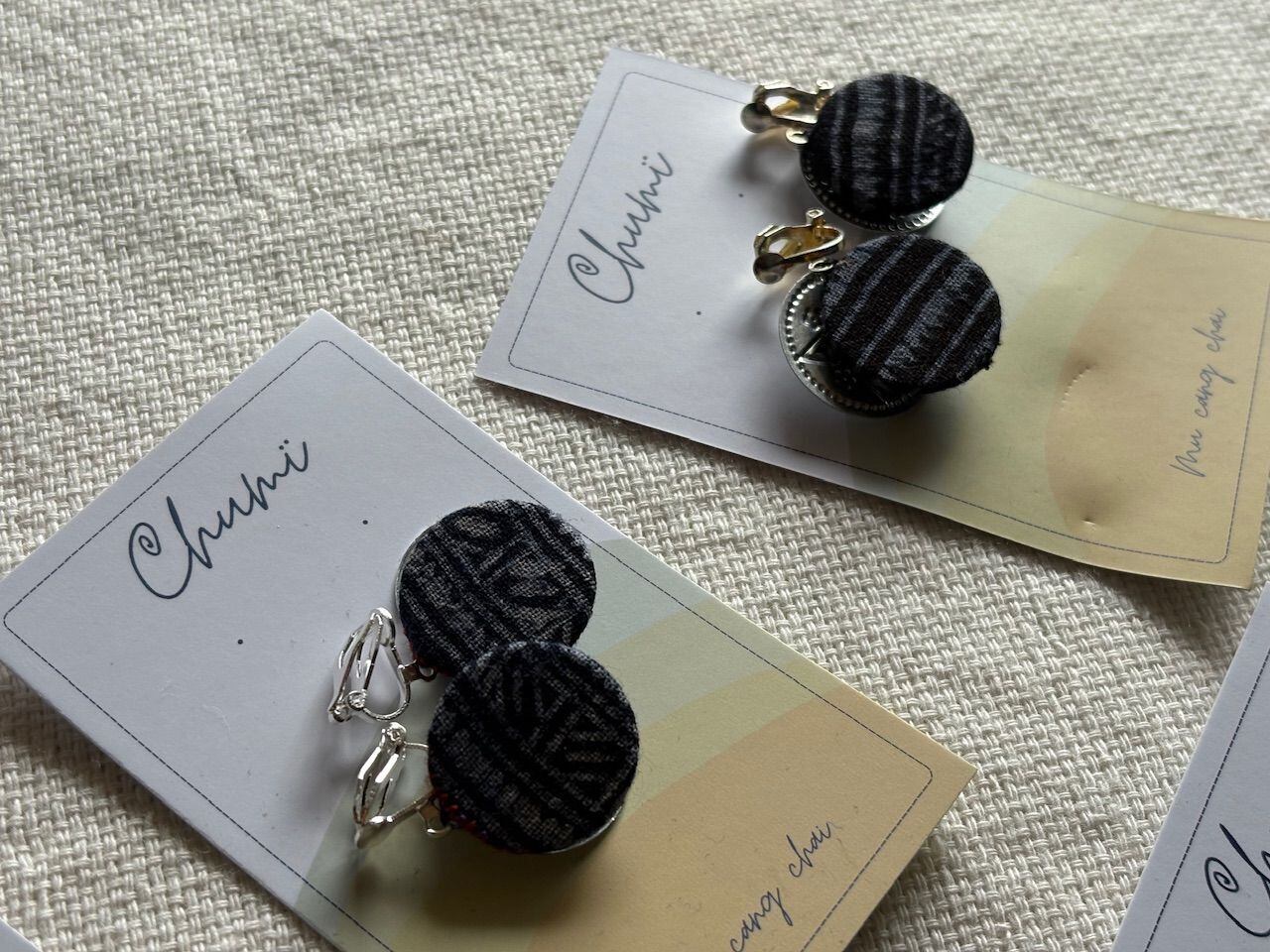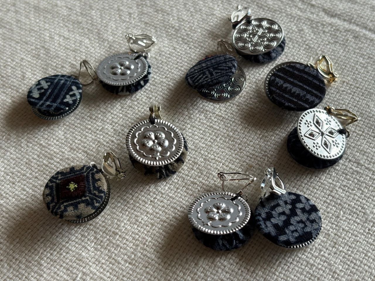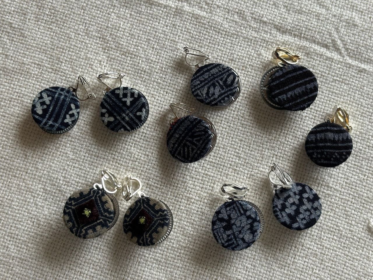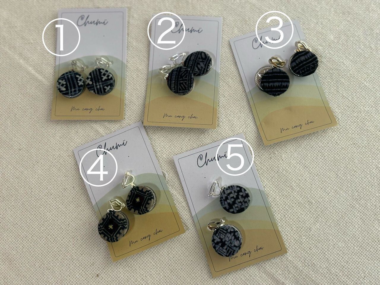 モン族の伝統文化の一つである、ろうけつ染めが施された藍染め布と女性の民族衣装に施される銀のコイン飾りが組み合わさったイヤリングです。後ろから見てもコインが素敵です。
