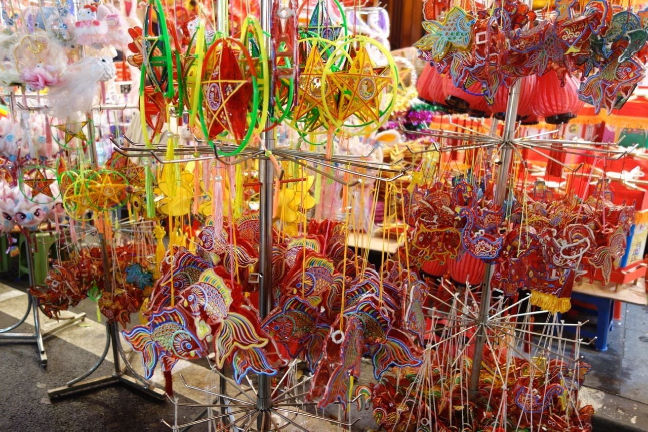 通りいっぱいにカラフルなセロハン製ランタンやお面、手作りの飾りが並びます。どこか懐かしさを感じる温かい光景で、昼も夜もお祭り気分を味わえる場所です。