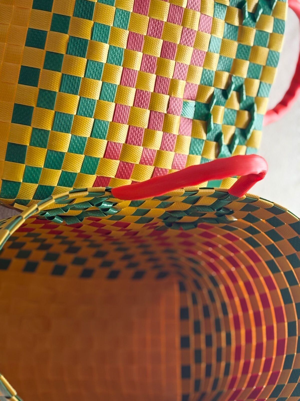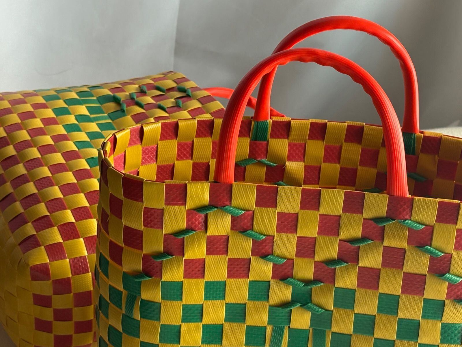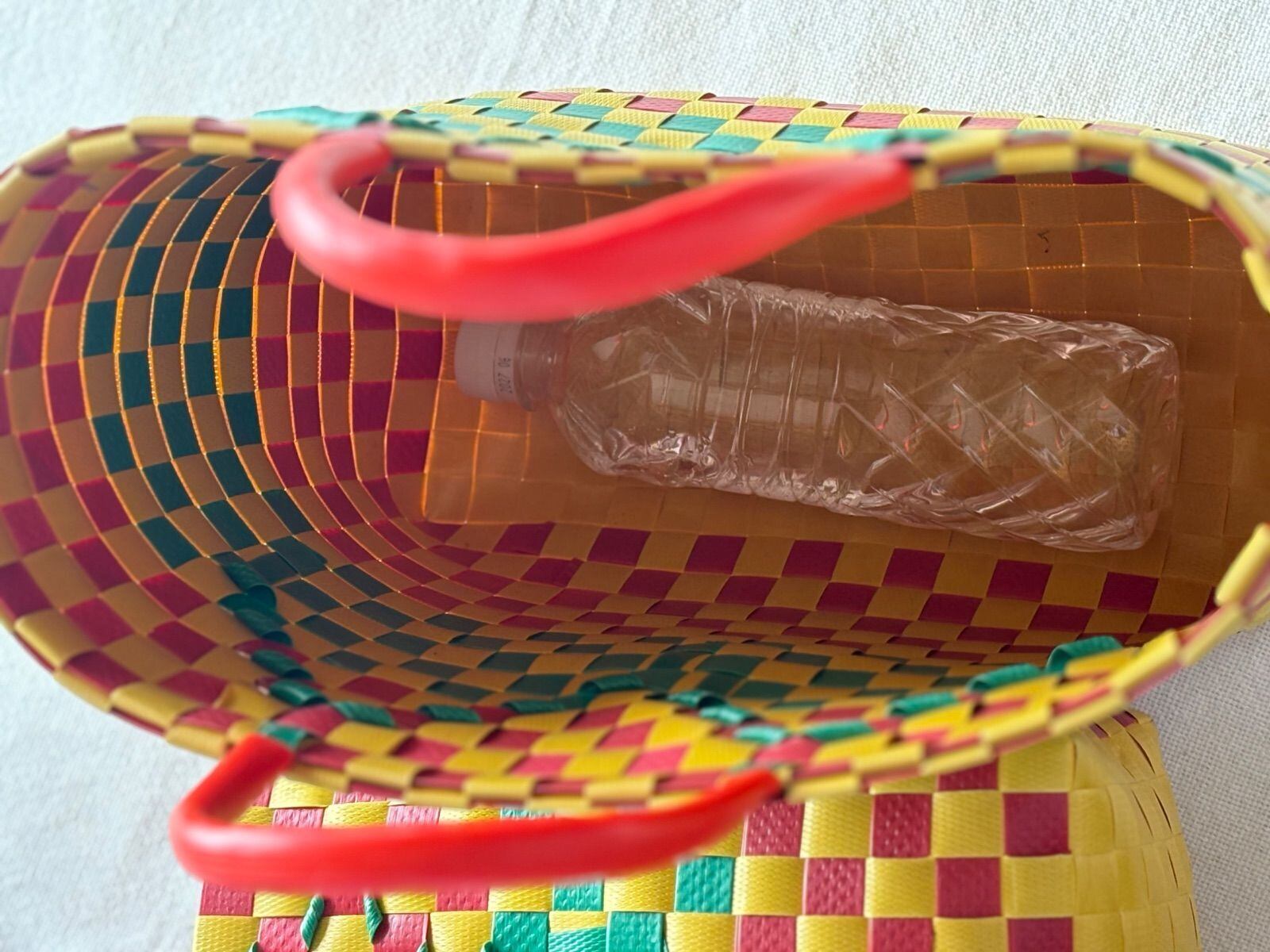 荷造り用プラスチックテープで編まれたベトナムのプラかごです。強度抜群で水洗いも出来ます。