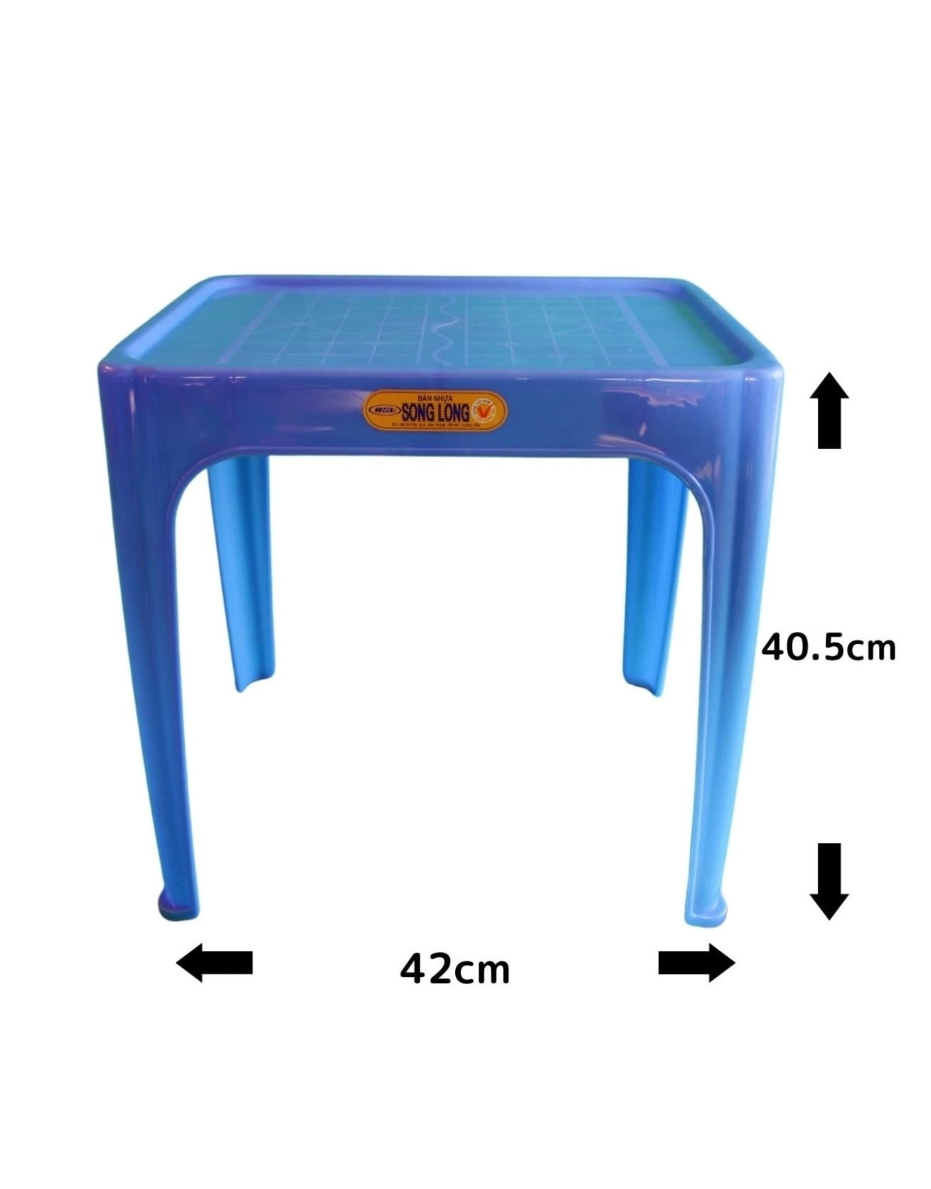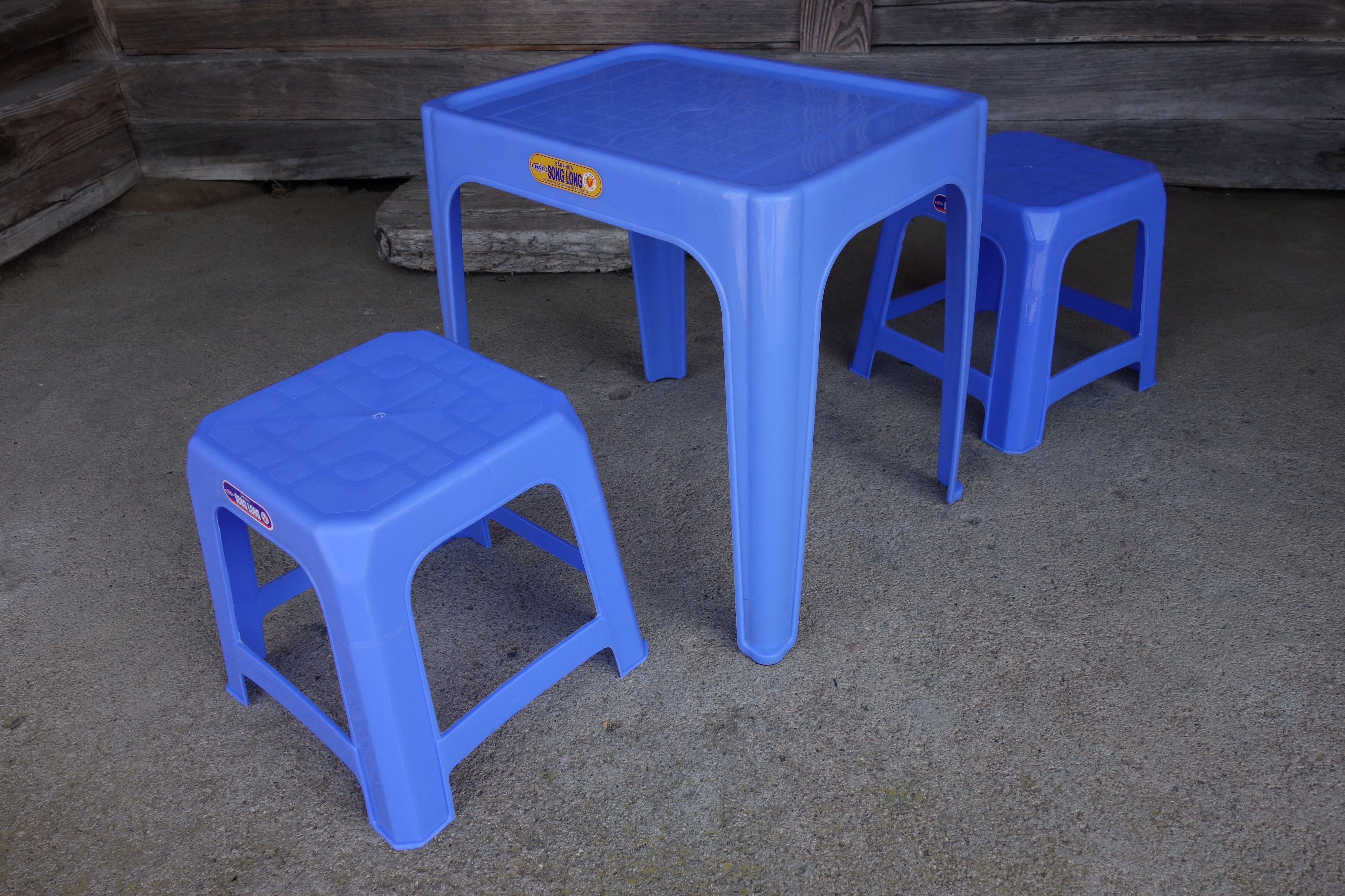 東南アジアの屋台や日常生活でよく見かける、カラフルでスタッキングできるプラスチック製のテーブルとイス2脚のセットです。 (合計3点のセット)
